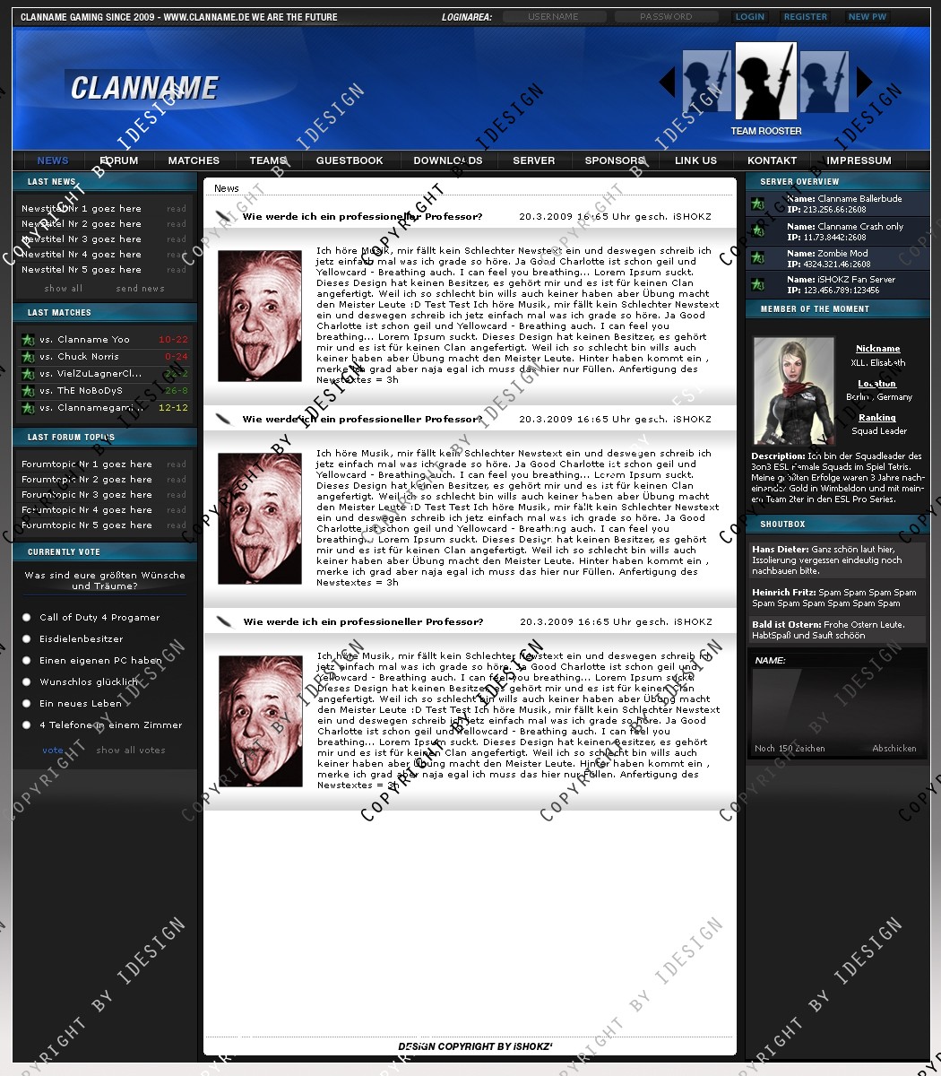 Dies ist ein professionelles Clandesign. Eine übersichtliche und geordnete psd Datei mit allen vorhandenen Ebenen ist vorhanden. Bei weiteren Fragen oder Support wenden sie sich per E-mail an "[email protected]" Dieses Design gibt es auch in blau. Schaut bei meinen Produkten