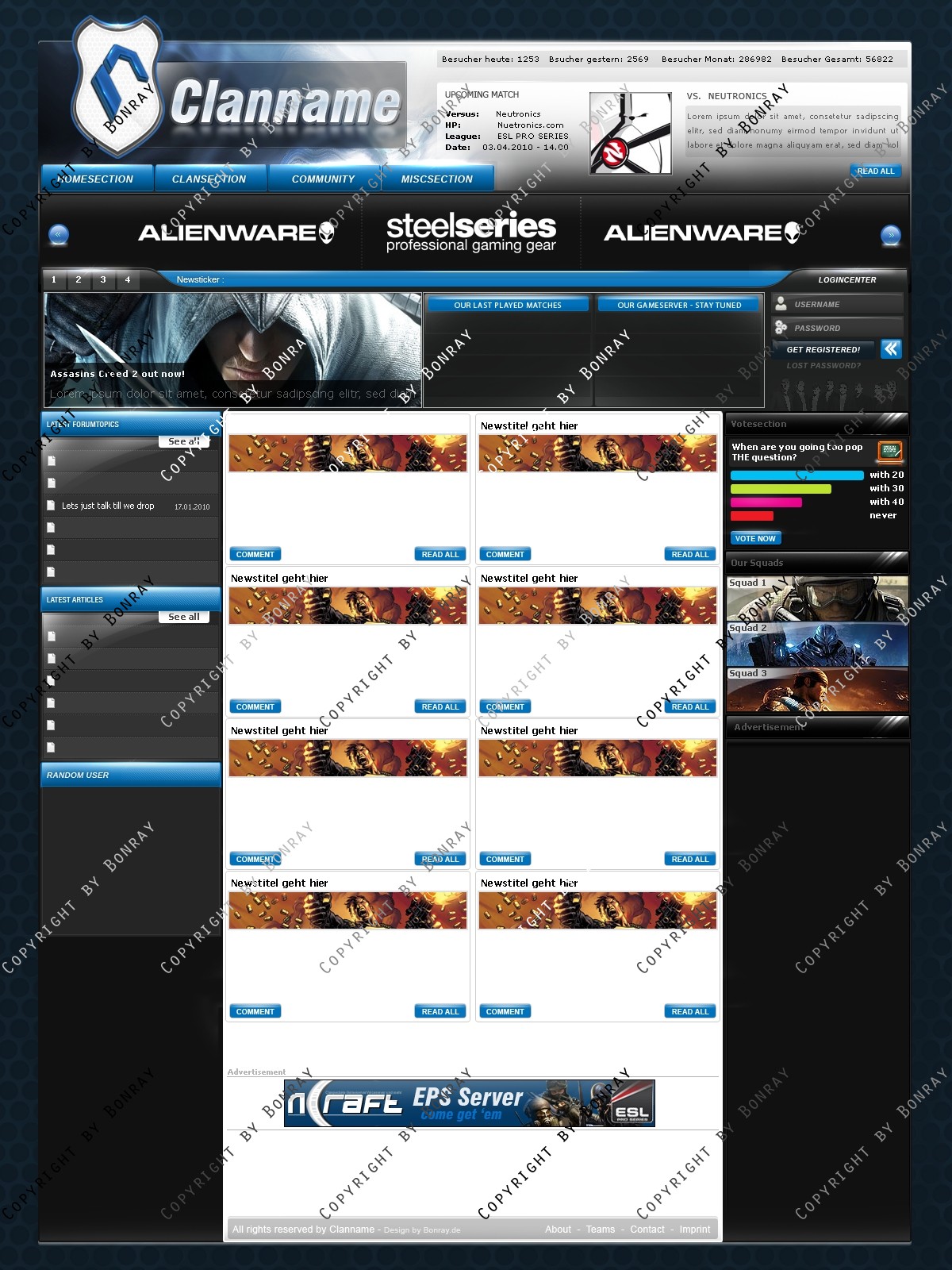 ich biete hier ein frisches, hochwertiges Clandesign in modernen Farben an. Das Design lässt sich einfach slicen und aufgrund des simplen Aufbaus leicht an gängige CMS Systeme wie Webspell und DZCP anpassen. Das Design lässt sich eigenhändig mit allen gängigen Photoshop Version bearbeiten.