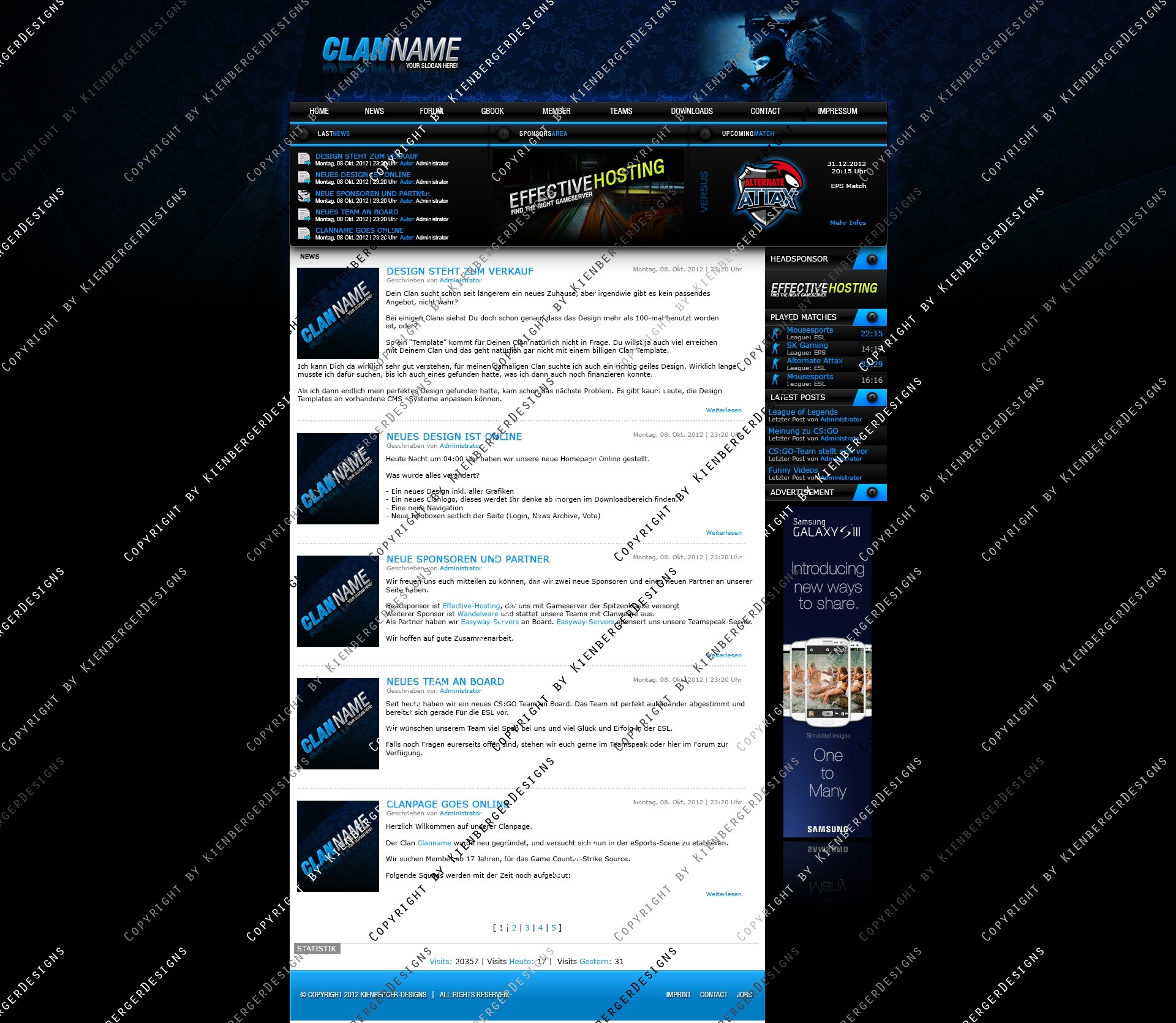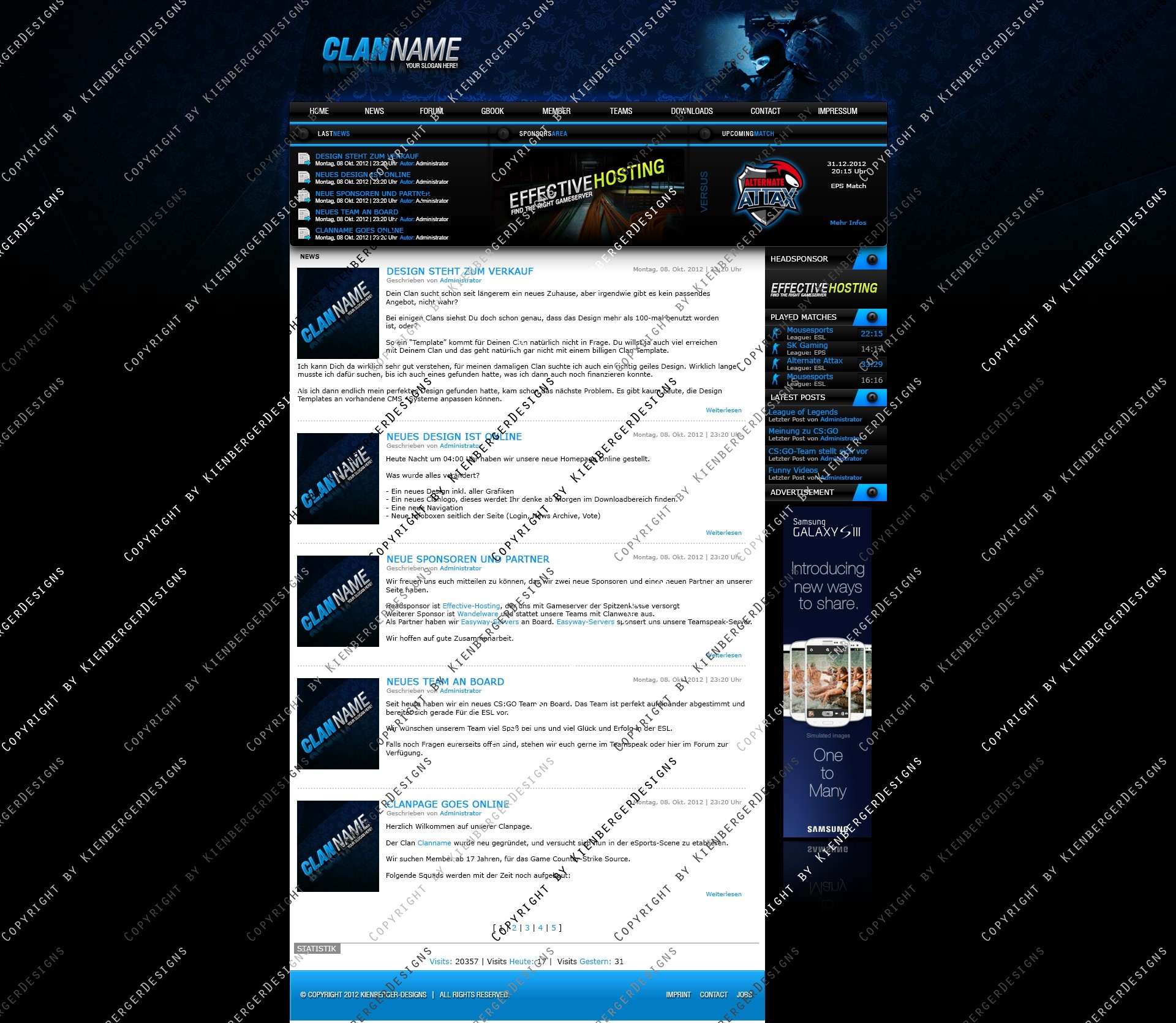 ich biete hier ein frisches, hochwertiges Clandesign in modernen Farben an. Das Design lässt sich einfach slicen und aufgrund des simplen Aufbaus leicht an gängige CMS Systeme wie Webspell und DZCP anpassen. Das Design lässt sich eigenhändig mit allen gängigen Photoshop Version bearbeiten.