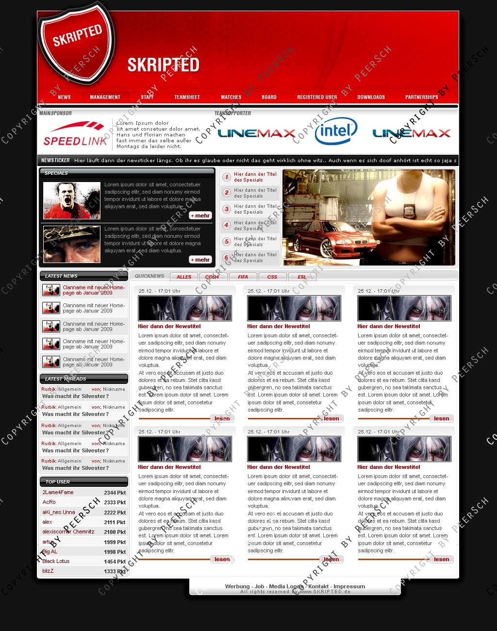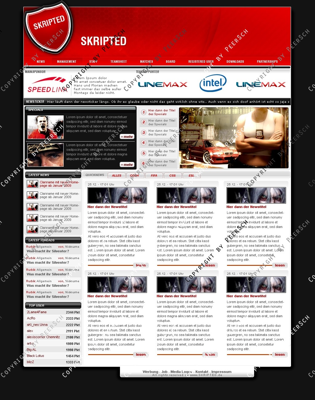 Was Sie hier kaufen ist lediglich die PSD Datei, gerne kann ich es Ihnen gegen einen Aufpreis von 13€ an ein CMS Anpassen, zur Auswahl stehen hierbei: webSPELL, Clansphere, Teklab, Devilz und andere CMS auf Anfrage ohne Aufpreis.