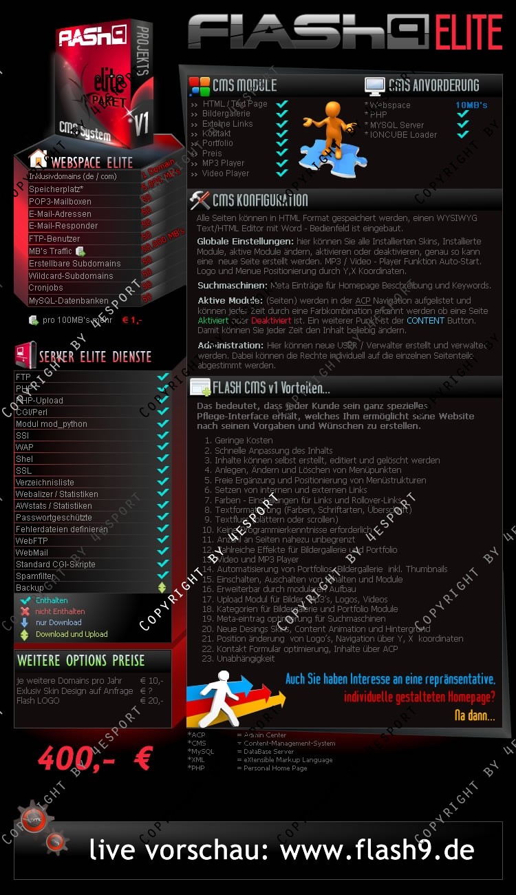 FLASH CMS V1 - Ein Content Management System, Corporate Design, Portfolio, Gallery, Mp3 Player, Video Player, Kontakt und Preiss Formular, V1 die Perfekte Flash CMS für Privat & Firmen.