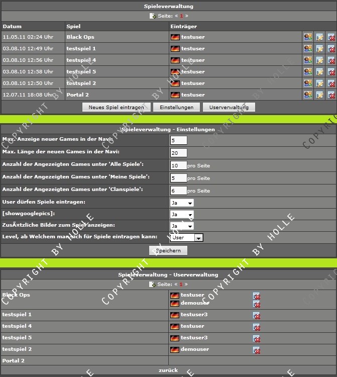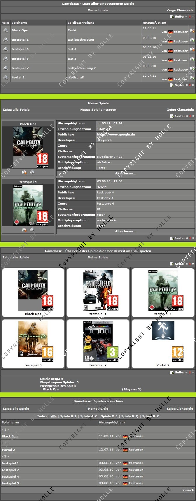 Angelehnt an das System der ESL habe ich hier eine Verwaltung für Spiele im Clan oder in der Community gecode, für die sich Member eintragen können. Zusätzlich können die Member im Clan eigene Spiele einreichen, indem sie ein Formular ausfüllen. (Dieses Feature kann aber vom Admin abgeschaltet werden)