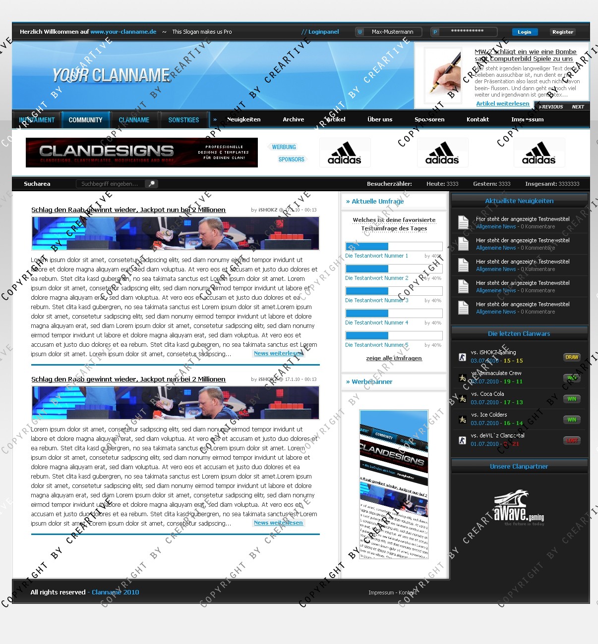 Wir passen das Template auf Ihren Namen an. Hierbei ändern wir die Headergrafik und die 2 Schriftzüge in der Kopf/Foot Leiste. Zudem ändern wir noch die 2 Werbebanner nach Ihren Wünschen und die 3 Sponsorengrafiken. Nur 9 Euro.