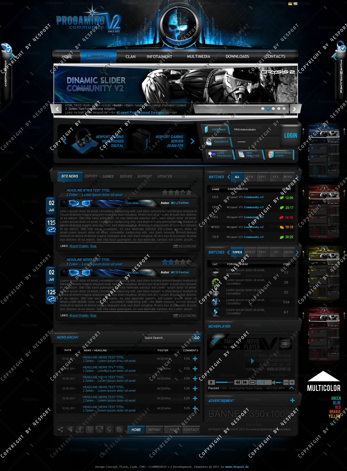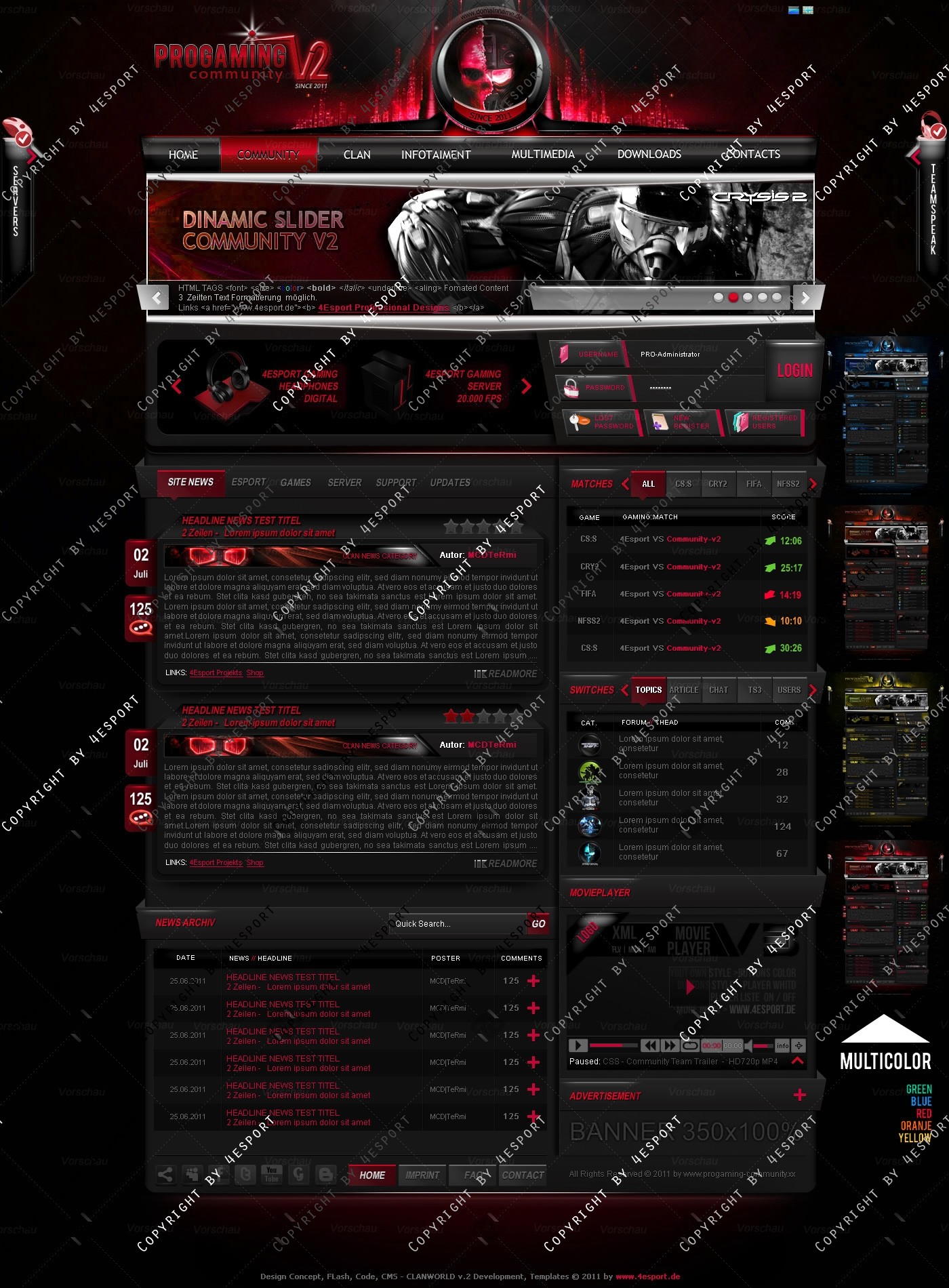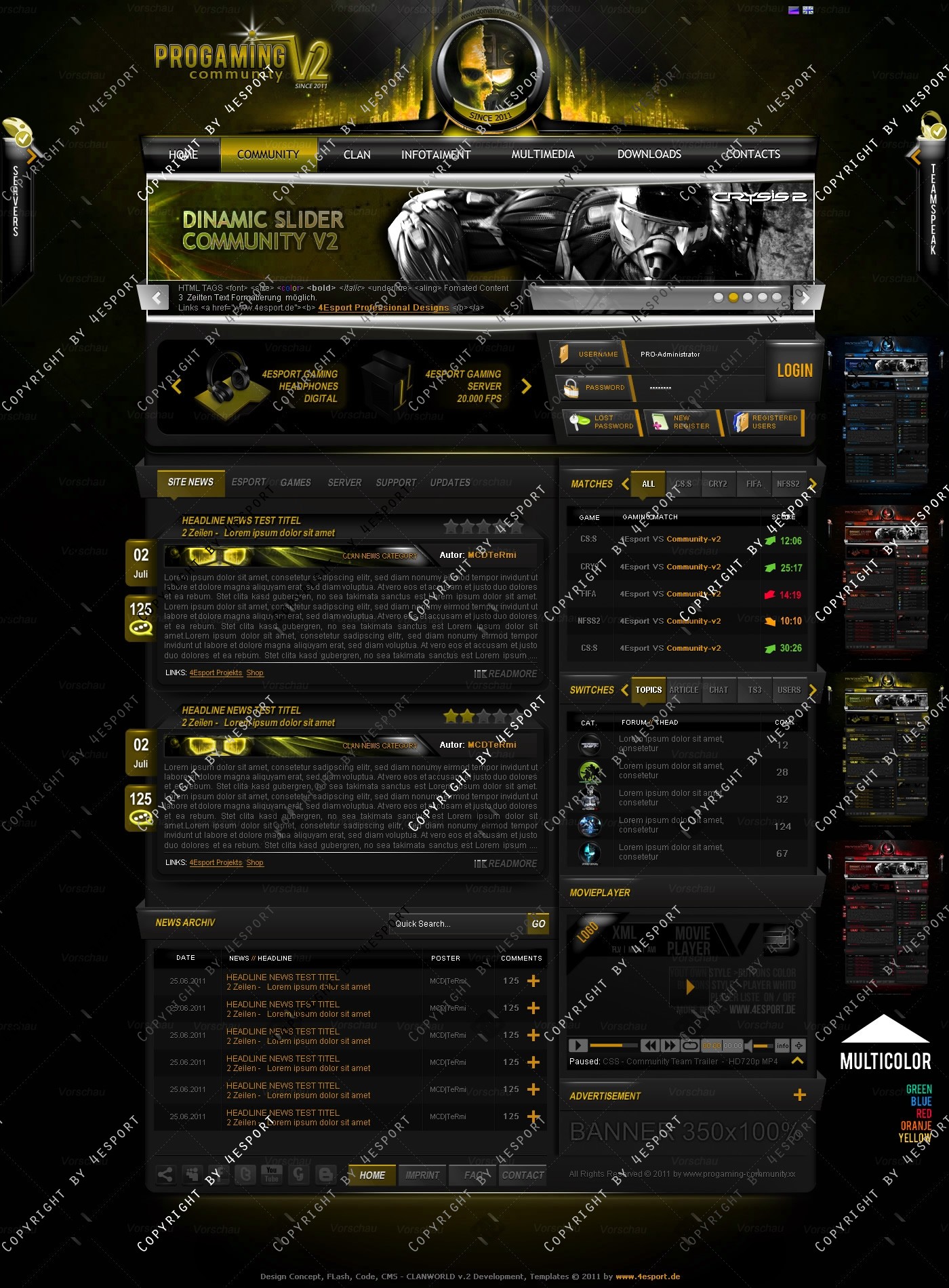 PROGaming Community V2 - Templates Premium Edition mit Flash Player 1 V3 Custom Edition und Featured System, CMS Erweiterung Webspell 4.2.2a, wird auf wünsch auf ClanWORLD v1.1 auch gecodet.